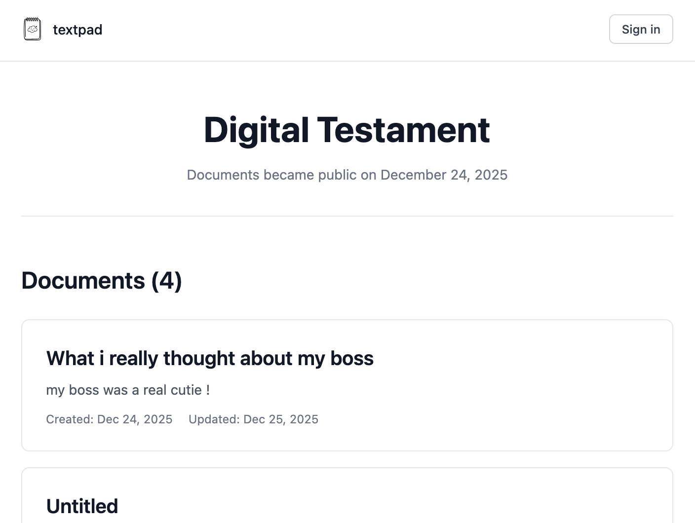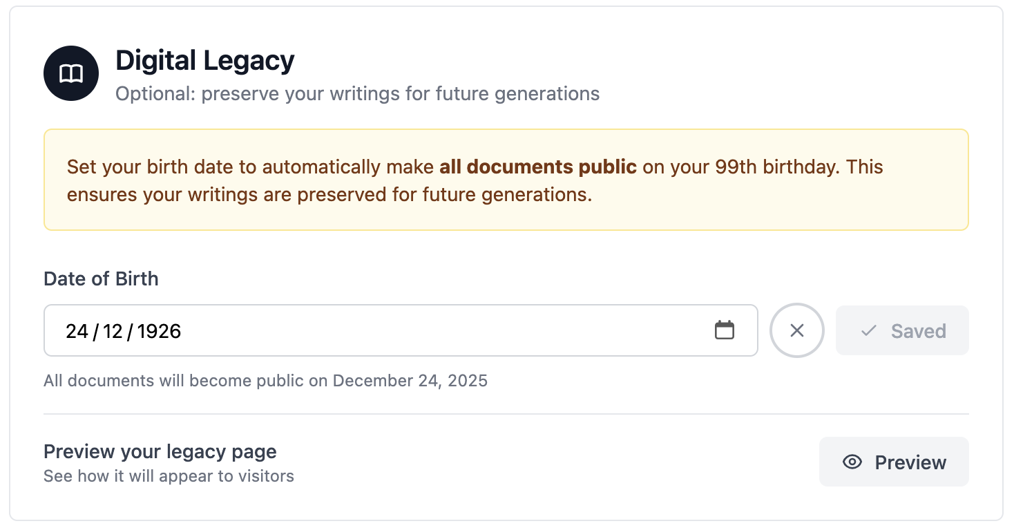 Everything is private by default. Your documents stay invisible until the date you've set. You can preview how your legacy page will look, and you can remove the feature anytime.